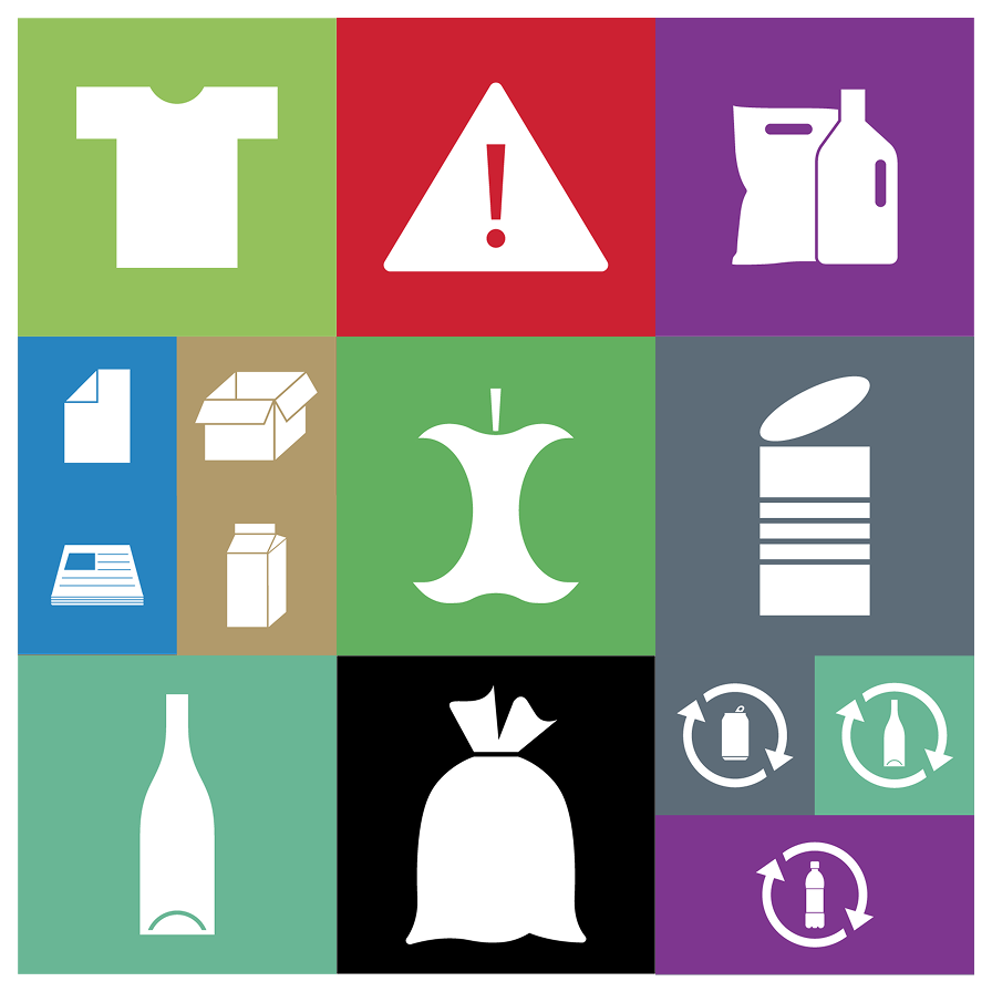 Lögbundin skylda er að nota samræmdar merkingar fyrir eftirfarandi flokka: Pappír og pappa, málma, plast, gler, lífúrgang, textíl og spilliefni.